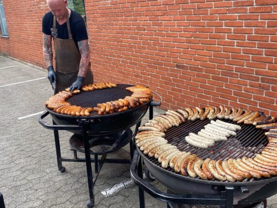 Medbringer pølsebakker, dip, pølsebrød, servietter.